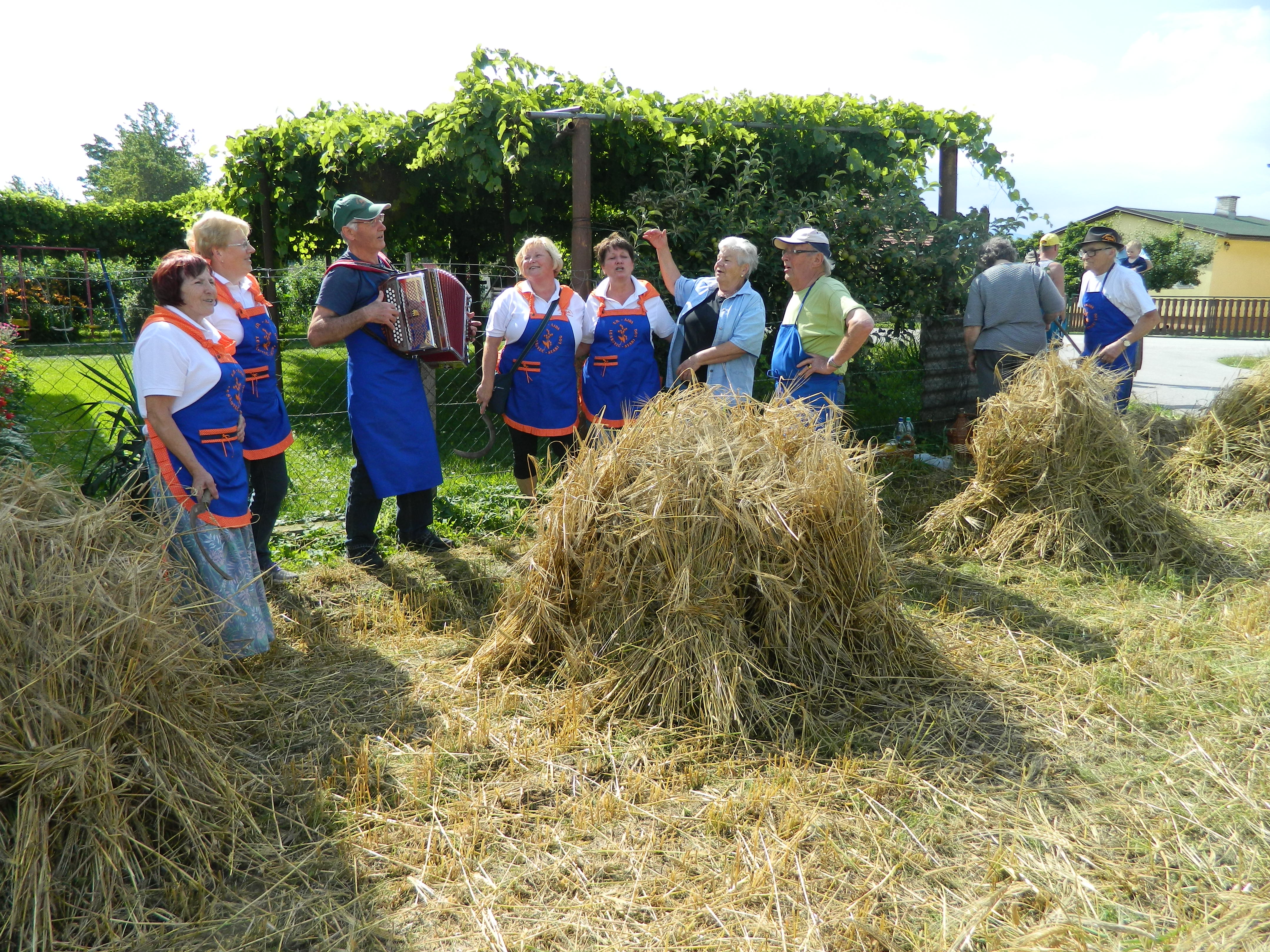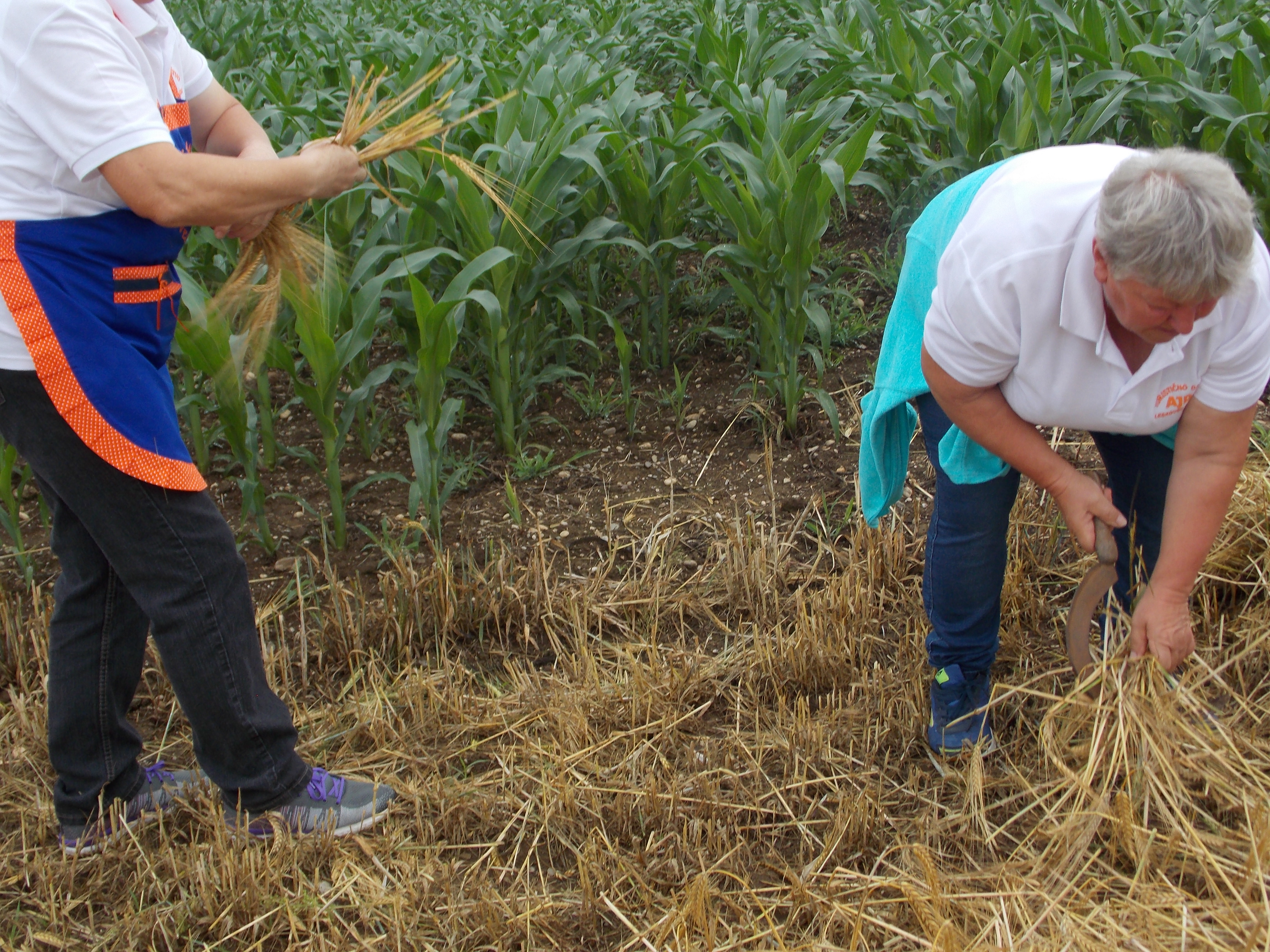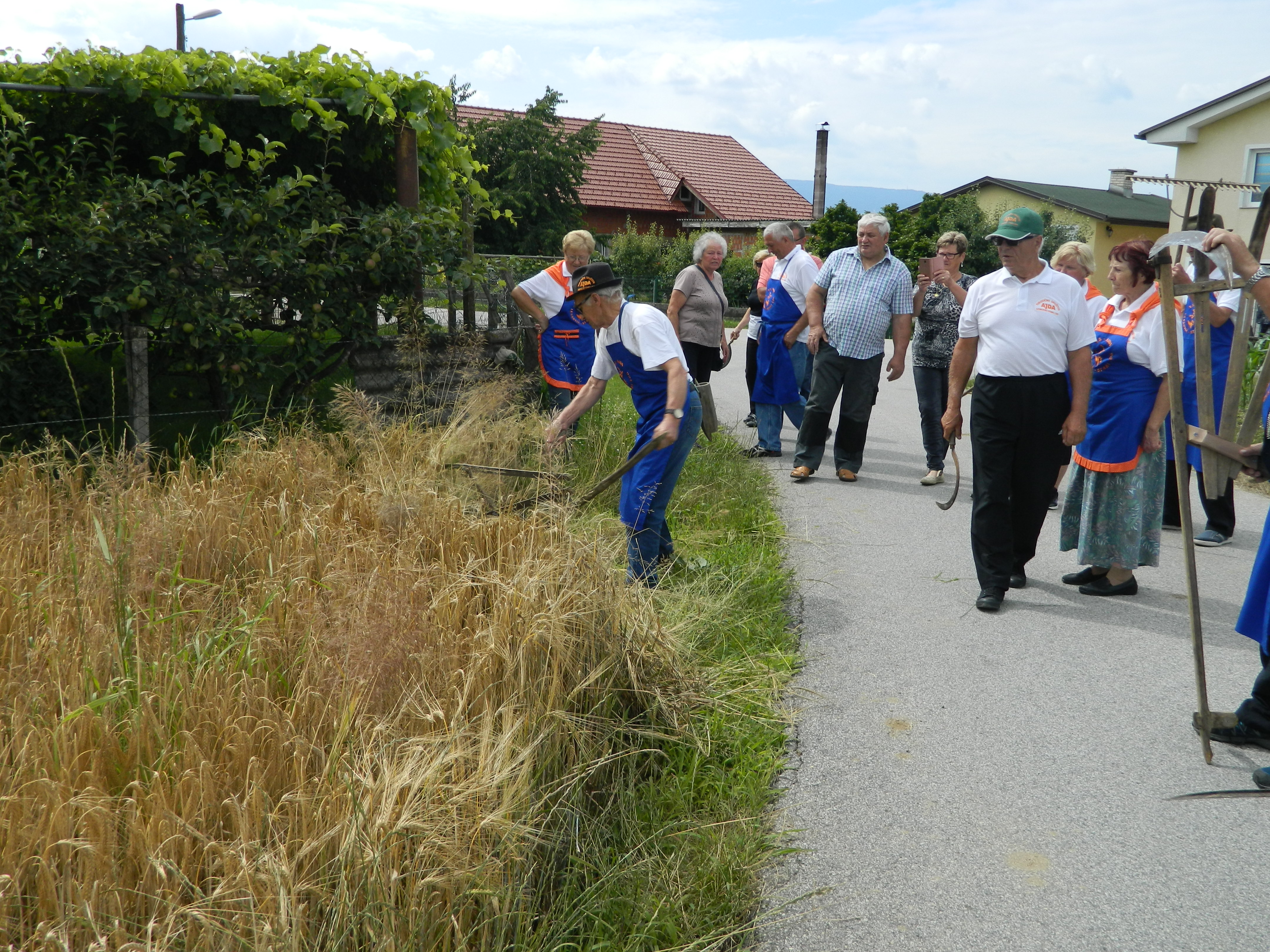 Člani društva AJDA smo 18.6.2017 pripravili prikaz žetve žita po starem običaju. Zbrali smo se na njivi in si razdelili delo. Moški so kosili, ženske so s srpi pobirale klasje in ga vezale v snope, ki smo jih postavili v kopice, da se je zrnje še bolj posušilo.