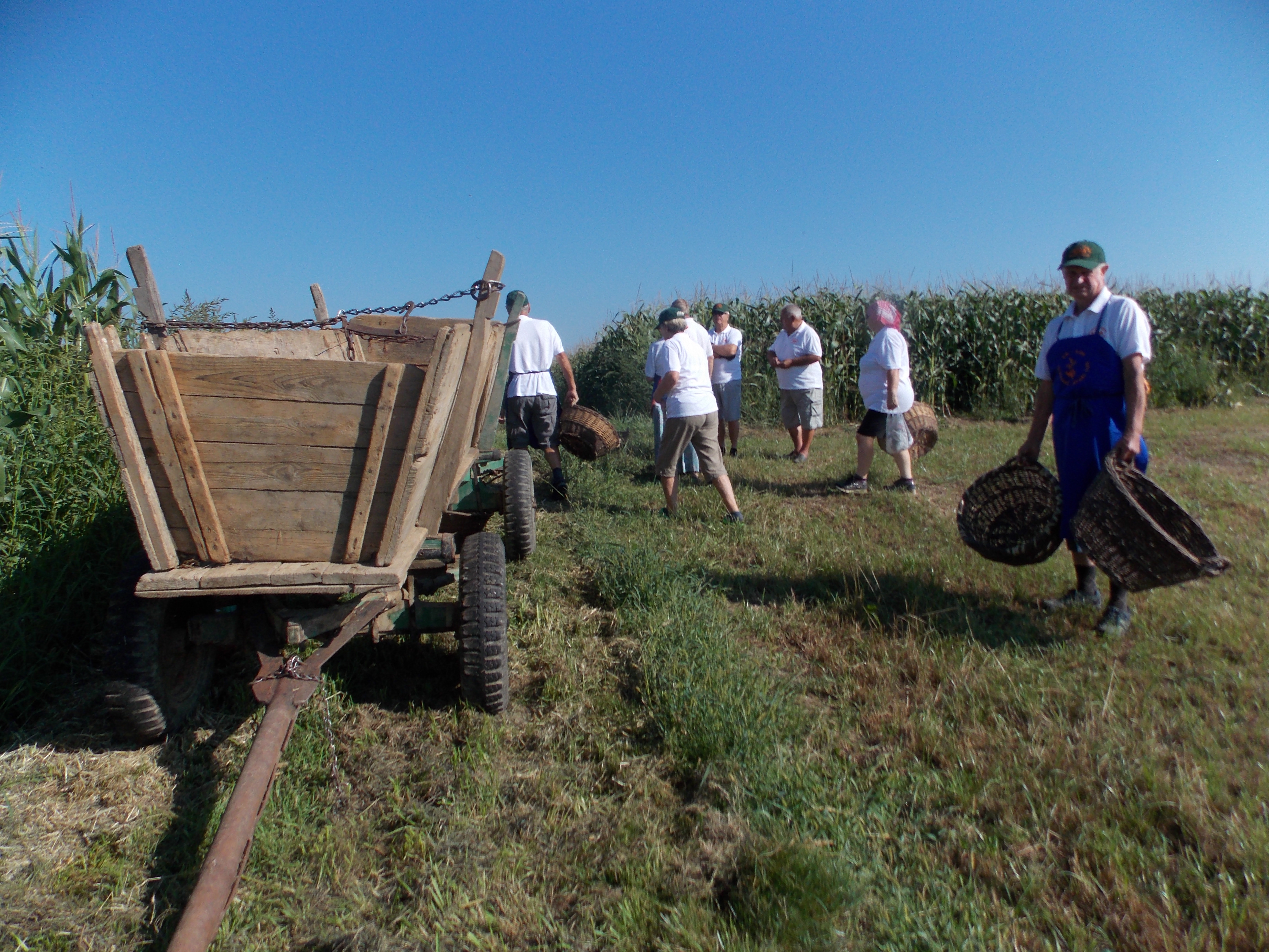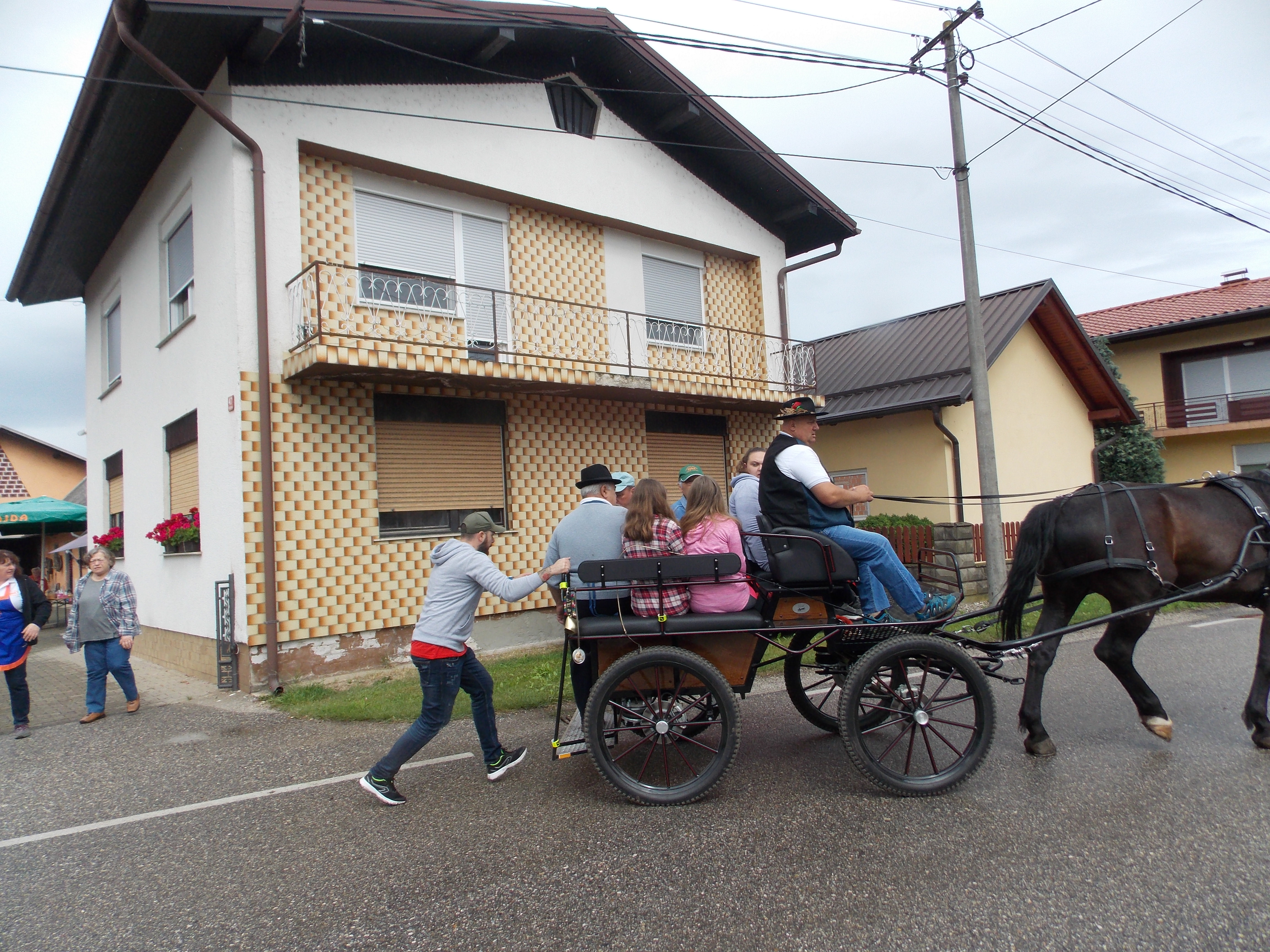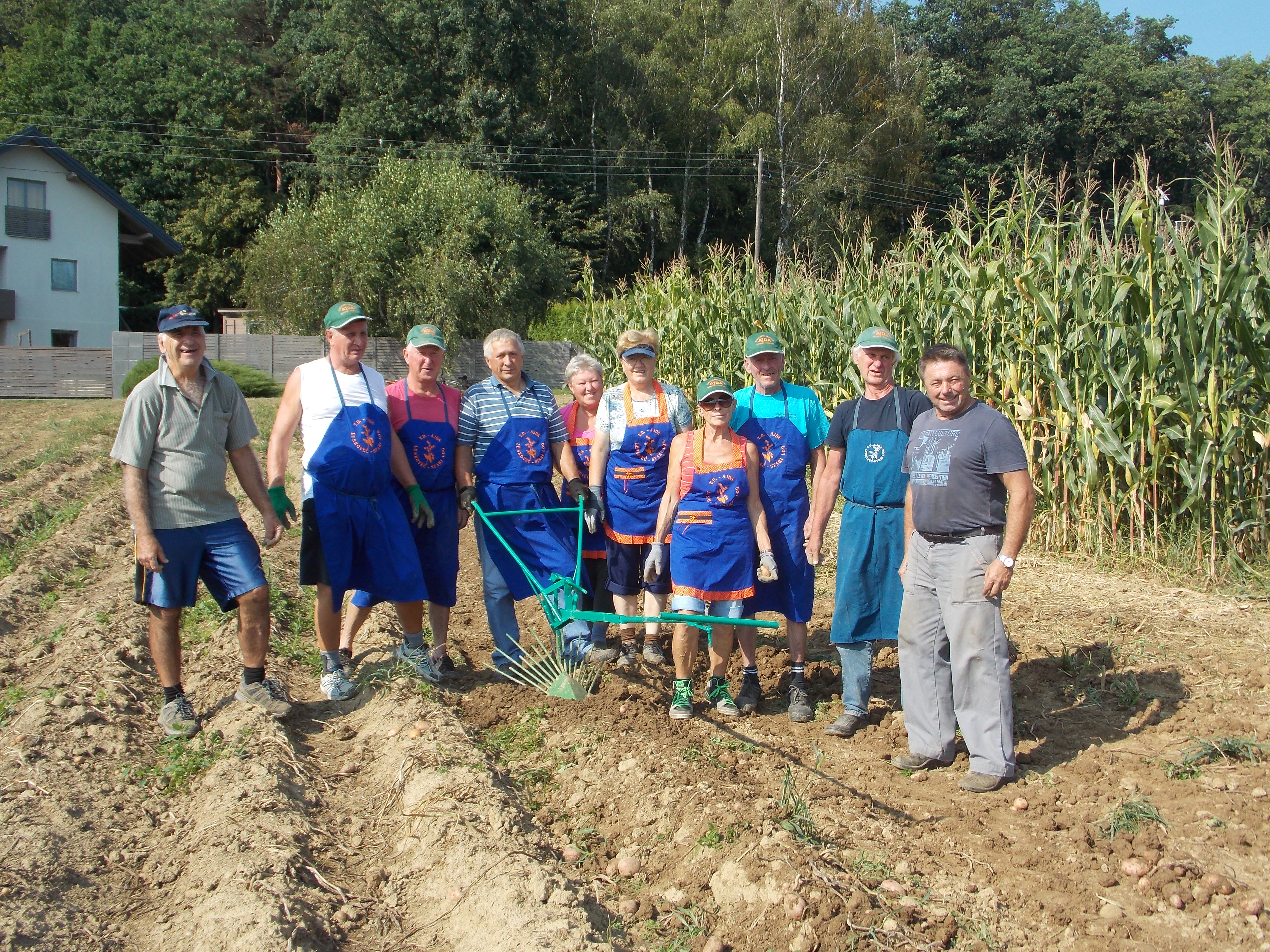 Tokrat je bila njiva nekoliko oddaljena, zato smo se tja odpeljali kar s tremi konjskimi vpregami, kar je zagotovo popestrilo celotno dogajanje. Kot vedno nas je spremljala vesela pesem ob zvokih harmonike našega člana Mirka. Po opravljenem delu smo se ponovno zbrali pri Finguštovih, kjer nas je že čakala malica in pecivo, ki so ga napekle naše prizadevne članice. Čeprav nam vreme ni bilo najbolj naklonjeno, smo se vseeno še kar nekaj časa družili in se zabavali, saj za dobro družbo ni pomembno ali dežuje ali pa sije sonce.
