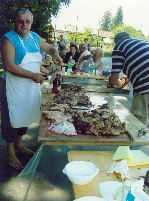 G. Breznik pripravlja pečeno svinjsko glavo za licitacijo, glavni mesar pa je naš Rudi, ki je tudi organiziral posebno košarko (v pletene košare smo metali bukova polena).