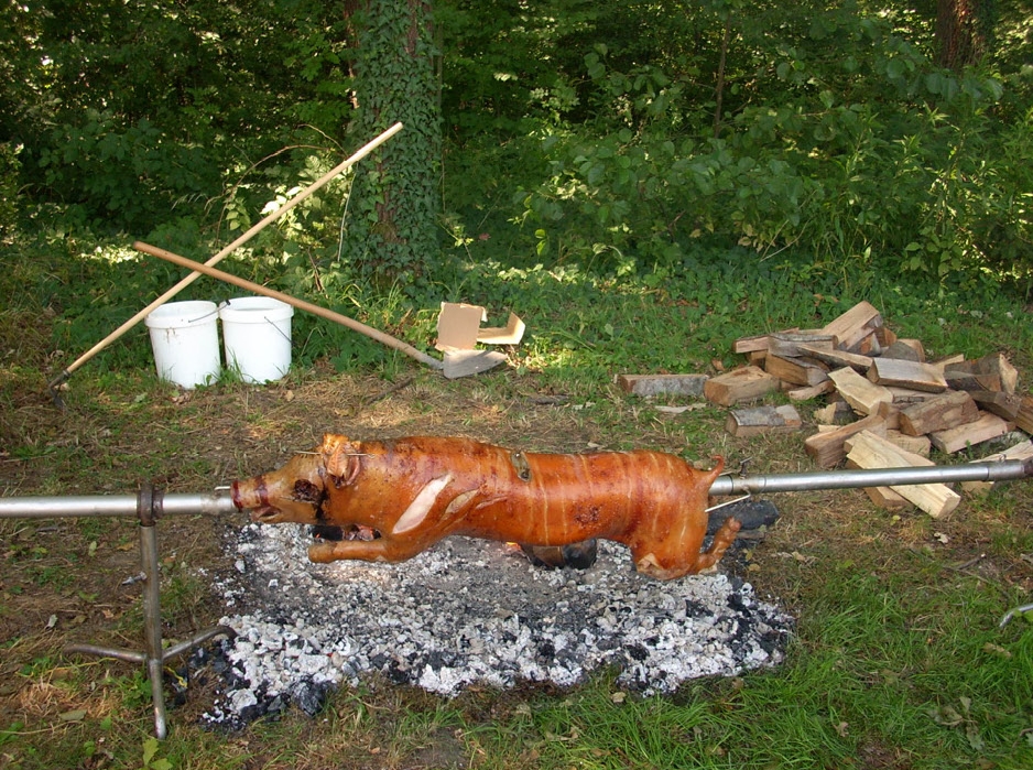 Pečenje odojka gre h kraju in mesar Rudi se že pripravlja ...