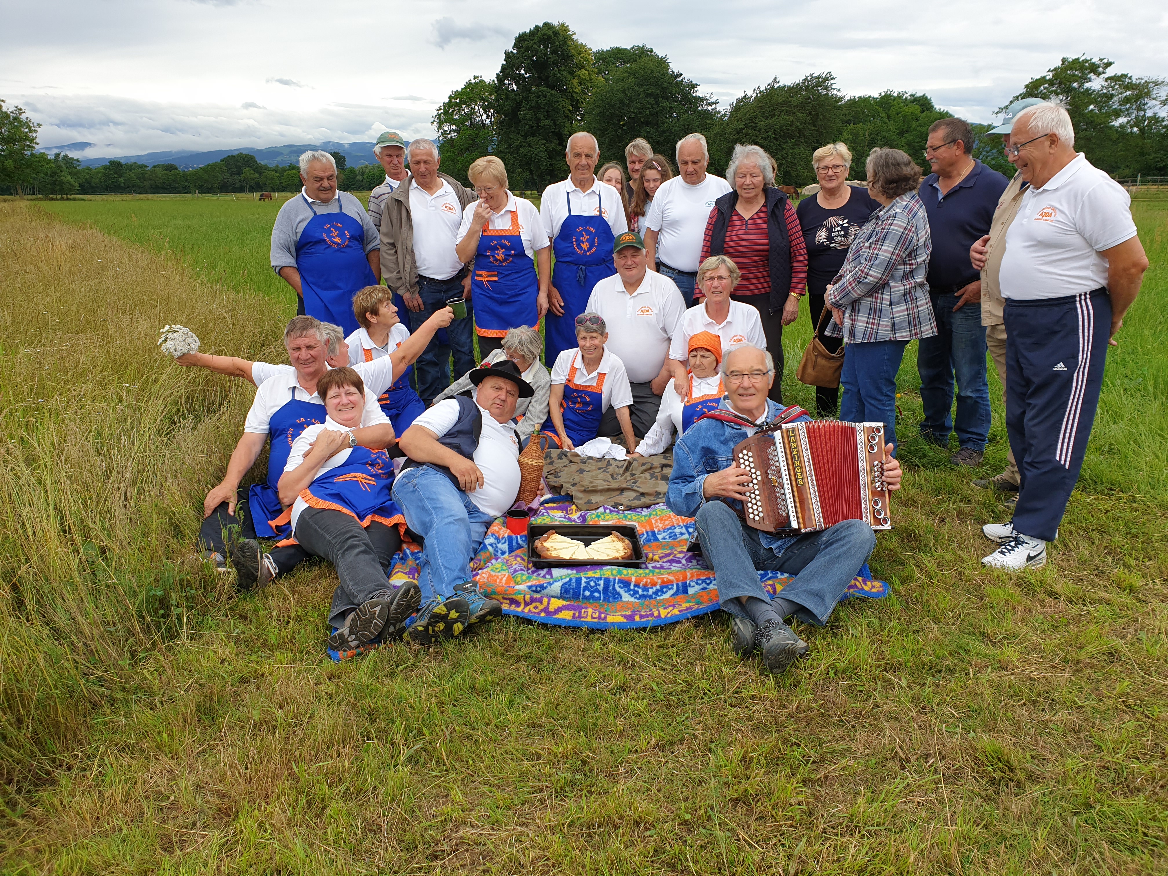 Kosci so nabrusili kose in se podali na travnik, kjer so kosili kot nekoč. To je bilo včasih težaško delo in so ga opravili že ob jutranjem svitu. Nato se je trava raztrosila za sušenje, zvečer pa pograbila v kupe imenovane »plasti«. Gospodinja je na travnik prinesla malico in tako je bilo tudi tokrat. Z veseljem smo se družili še naprej ob zvokih harmonike našega člana Mirka.