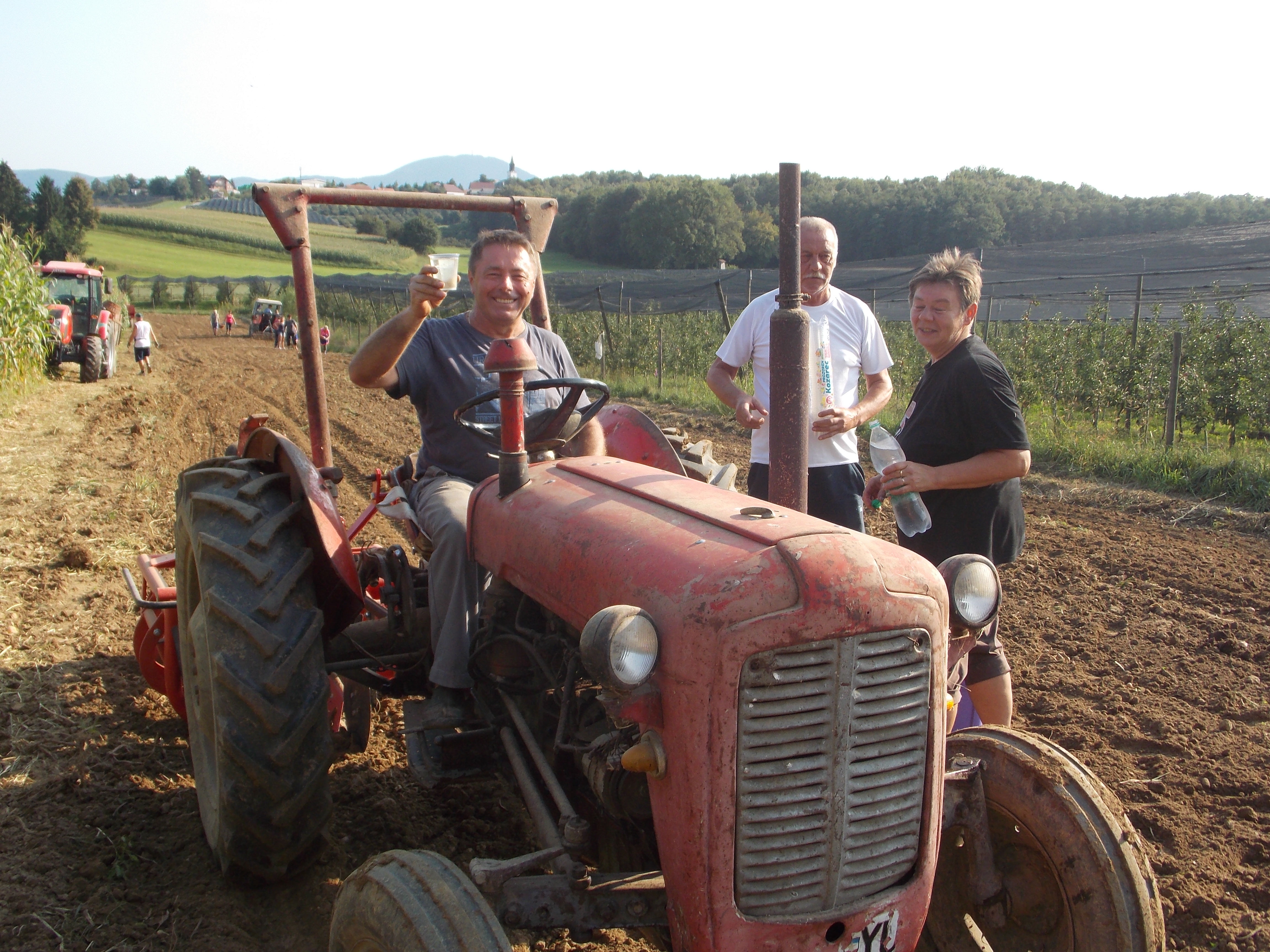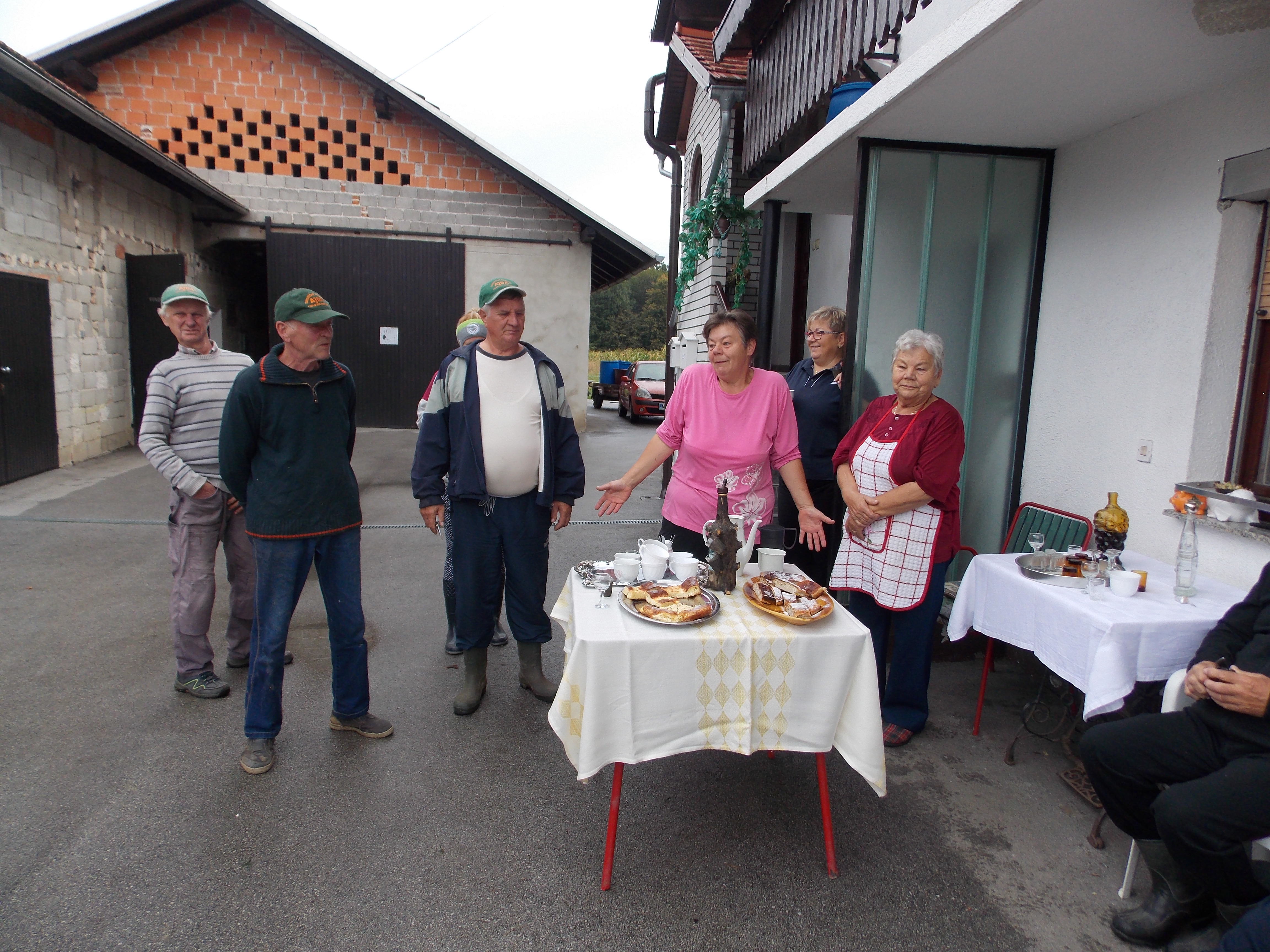 Tokrat je bila njiva nekoliko oddaljena, zato smo se tja odpeljali kar s tremi konjskimi vpregami, kar je zagotovo popestrilo celotno dogajanje. Kot vedno nas je spremljala vesela pesem ob zvokih harmonike našega člana Mirka. Po opravljenem delu smo se ponovno zbrali pri Finguštovih, kjer nas je že čakala malica in pecivo, ki so ga napekle naše prizadevne članice. Čeprav nam vreme ni bilo najbolj naklonjeno, smo se vseeno še kar nekaj časa družili in se zabavali, saj za dobro družbo ni pomembno ali dežuje ali pa sije sonce.