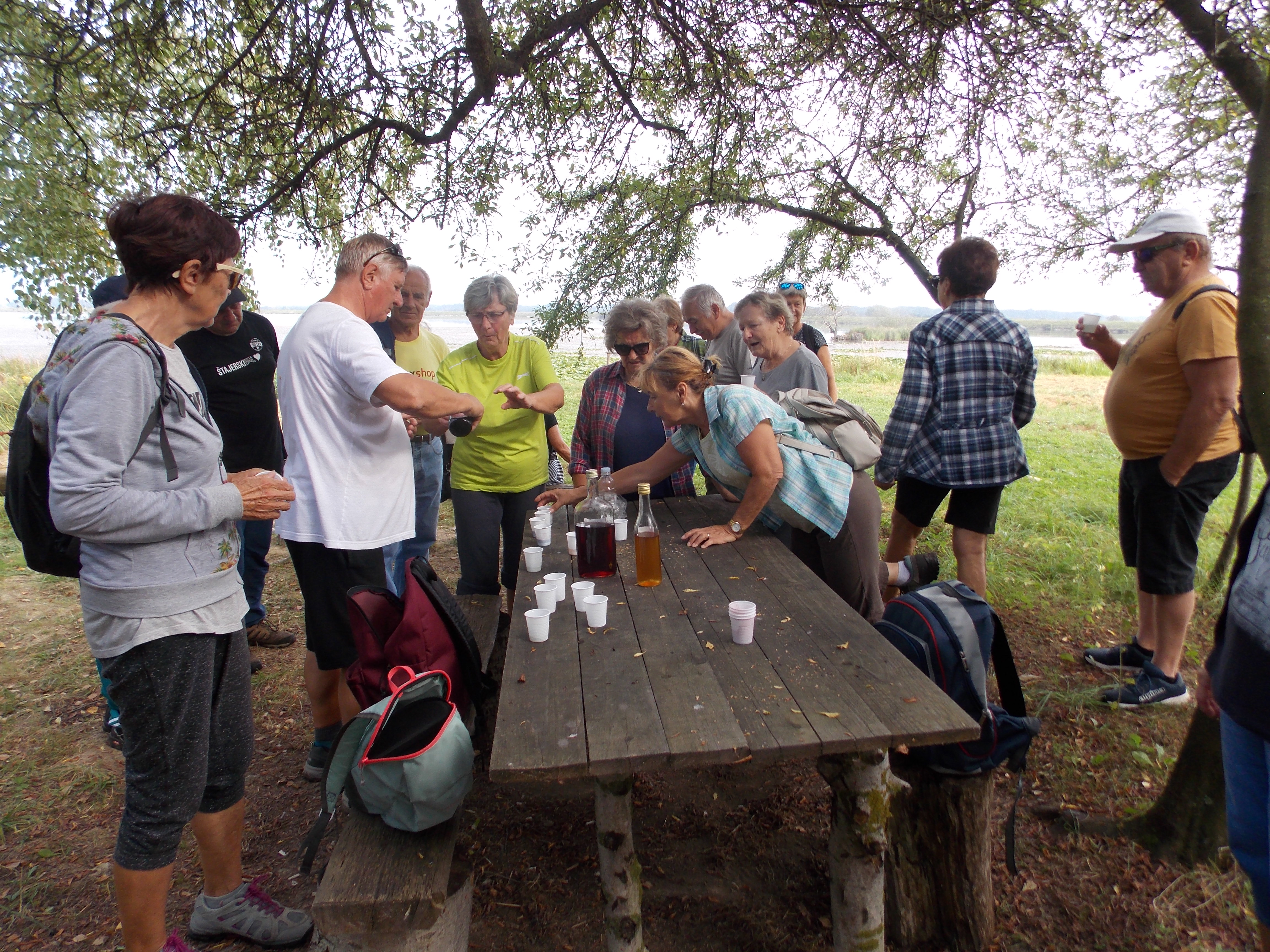 Po kratkem postanku smo nadaljevali pot ob drevoredu, ki ga na novo urejajo krajani in so zasajena res zanimiva drevesa. Nato smo se sprehodili med polji in kaj kmalu prispeli do jezera, kjer je čudovit ambient z lokvanji, labodi in drugimi pticami. Sledilo je »razkuževanje« in krajši počitek, nato pa smo nadaljevali pot nazaj do kozolca.