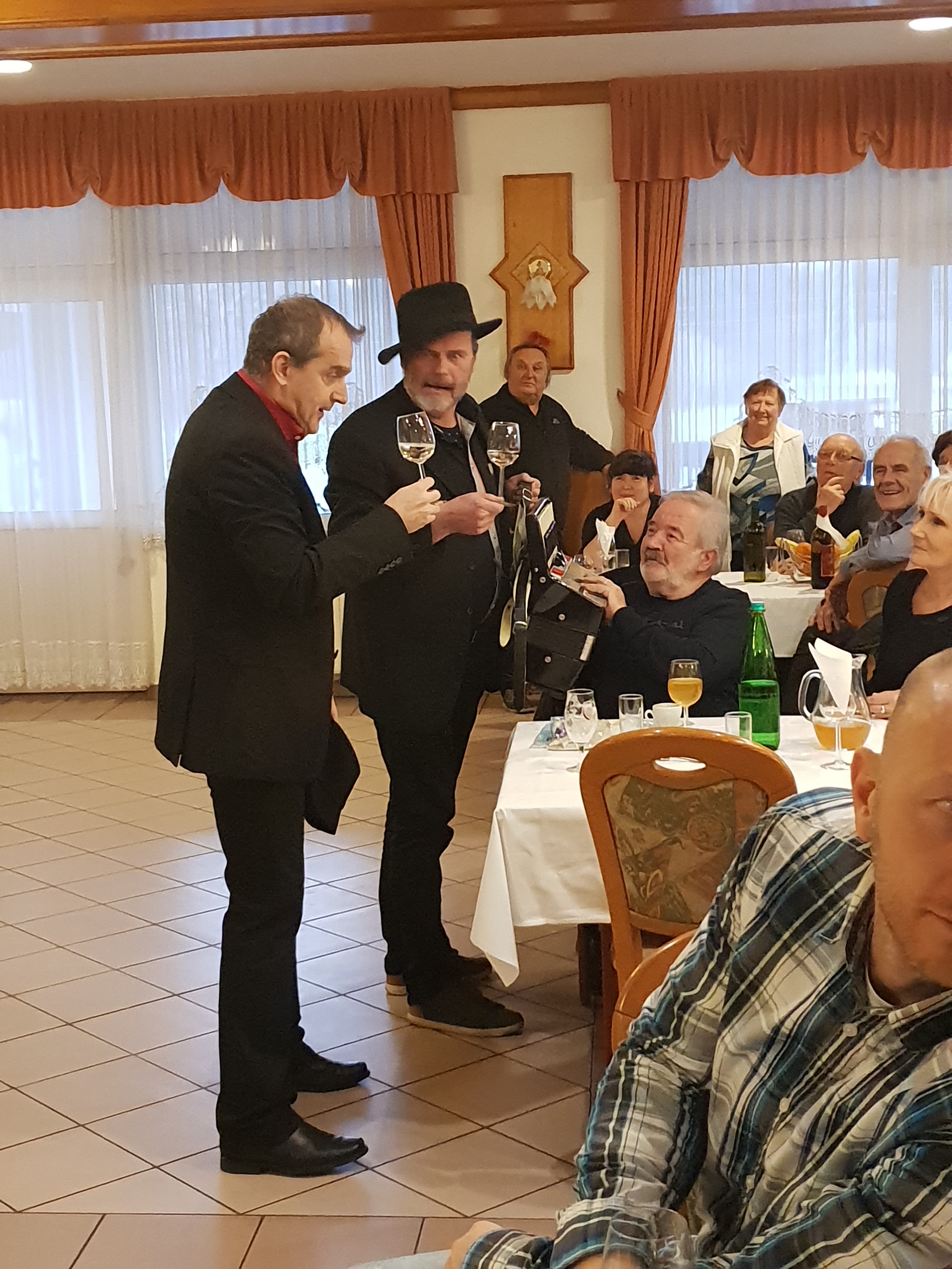 Ob spremljavi glasbe je sledila pogostitev s kosilom in po prvem plesu članov, sta presenetila z prihodom člana Uščip teatra Dejan Kalan in Marjan Krajnc. Izvedla sta satirični kabare Ogledala,v preobleki pridigarja in pijančka sta vse prisotne nasmejala do solz.